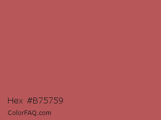 Hex #b75759 Color is a normal red color and the nearest color is Matrix #b05d54. Hex code #b75759 and RGB value is rgb(183,87,89). In RGB color space, this color is composed of 72% red, 34% green, 35% blue, In CMYK color space, this color is composed of 0% cyan, 52% magenta, 51% yellow , 28% black , In HSL color space, this color has a hue angle of 359° , 40% saturation and 53% lightness.