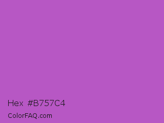 Hex #b757c4 Color is a normal magenta color and the nearest color is Fuchsia Pink #c154c1. Hex code #b757c4 and RGB value is rgb(183,87,196). In RGB color space, this color is composed of 72% red, 34% green, 77% blue, In CMYK color space, this color is composed of 7% cyan, 56% magenta, 0% yellow , 23% black , In HSL color space, this color has a hue angle of 293° , 48% saturation and 55% lightness.