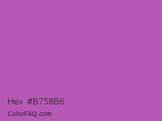 Hex #b758b6 Color is a normal magenta color and the nearest color is Fuchsia Pink #c154c1. Hex code #b758b6 and RGB value is rgb(183,88,182). In RGB color space, this color is composed of 72% red, 35% green, 71% blue, In CMYK color space, this color is composed of 0% cyan, 52% magenta, 1% yellow , 28% black , In HSL color space, this color has a hue angle of 301° , 40% saturation and 53% lightness.