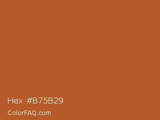 Hex #b75b29 Color is a normal orange color and the nearest color is Tuscany #bd5e2e. Hex code #b75b29 and RGB value is rgb(183,91,41). In RGB color space, this color is composed of 72% red, 36% green, 16% blue, In CMYK color space, this color is composed of 0% cyan, 50% magenta, 78% yellow , 28% black , In HSL color space, this color has a hue angle of 21° , 63% saturation and 44% lightness.