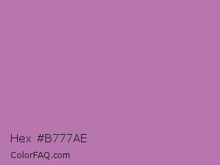 Hex #b777ae Color is a normal magenta color and the nearest color is Opera Mauve #b784a7. Hex code #b777ae and RGB value is rgb(183,119,174). In RGB color space, this color is composed of 72% red, 47% green, 68% blue, In CMYK color space, this color is composed of 0% cyan, 35% magenta, 5% yellow , 28% black , In HSL color space, this color has a hue angle of 308° , 31% saturation and 59% lightness.