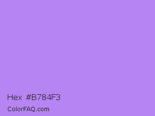 Hex #b784f3 Color is a light violet color and the nearest color is Bright Lavender #bf94e4. Hex code #b784f3 and RGB value is rgb(183,132,243). In RGB color space, this color is composed of 72% red, 52% green, 95% blue, In CMYK color space, this color is composed of 25% cyan, 46% magenta, 0% yellow , 5% black , In HSL color space, this color has a hue angle of 268° , 82% saturation and 74% lightness.