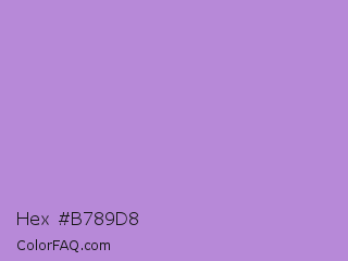 Hex #b789d8 Color is a light purple color and the nearest color is Lavender #b57edc. Hex code #b789d8 and RGB value is rgb(183,137,216). In RGB color space, this color is composed of 72% red, 54% green, 85% blue, In CMYK color space, this color is composed of 15% cyan, 37% magenta, 0% yellow , 15% black , In HSL color space, this color has a hue angle of 275° , 50% saturation and 69% lightness.