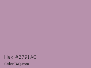 Hex #b791ac Color is a light magenta color and the nearest color is Lilac Luster #ae98aa. Hex code #b791ac and RGB value is rgb(183,145,172). In RGB color space, this color is composed of 72% red, 57% green, 67% blue, In CMYK color space, this color is composed of 0% cyan, 21% magenta, 6% yellow , 28% black , In HSL color space, this color has a hue angle of 317° , 21% saturation and 64% lightness.