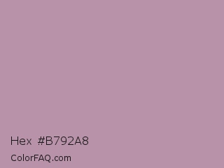 Hex #b792a8 Color is a light magenta color and the nearest color is Lilac Luster #ae98aa. Hex code #b792a8 and RGB value is rgb(183,146,168). In RGB color space, this color is composed of 72% red, 57% green, 66% blue, In CMYK color space, this color is composed of 0% cyan, 20% magenta, 8% yellow , 28% black , In HSL color space, this color has a hue angle of 324° , 20% saturation and 65% lightness.