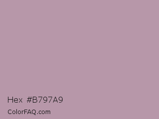 Hex #b797a9 Color is a light magenta color and the nearest color is Lilac Luster #ae98aa. Hex code #b797a9 and RGB value is rgb(183,151,169). In RGB color space, this color is composed of 72% red, 59% green, 66% blue, In CMYK color space, this color is composed of 0% cyan, 17% magenta, 8% yellow , 28% black , In HSL color space, this color has a hue angle of 326° , 18% saturation and 65% lightness.
