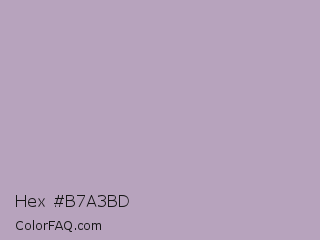 Hex #b7a3bd Color is a light purple color and the nearest color is London Hue #bea6c3. Hex code #b7a3bd and RGB value is rgb(183,163,189). In RGB color space, this color is composed of 72% red, 64% green, 74% blue, In CMYK color space, this color is composed of 3% cyan, 14% magenta, 0% yellow , 26% black , In HSL color space, this color has a hue angle of 286° , 16% saturation and 69% lightness.