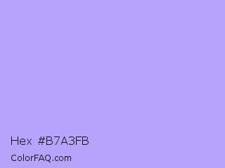 Hex #b7a3fb Color is a very light indigo color and the nearest color is Biloba Flower #b2a1ea. Hex code #b7a3fb and RGB value is rgb(183,163,251). In RGB color space, this color is composed of 72% red, 64% green, 98% blue, In CMYK color space, this color is composed of 27% cyan, 35% magenta, 0% yellow , 2% black , In HSL color space, this color has a hue angle of 254° , 92% saturation and 81% lightness.