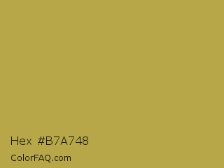 Hex #b7a748 Color is a normal yellow color and the nearest color is Brass #b5a642. Hex code #b7a748 and RGB value is rgb(183,167,72). In RGB color space, this color is composed of 72% red, 65% green, 28% blue, In CMYK color space, this color is composed of 0% cyan, 9% magenta, 61% yellow , 28% black , In HSL color space, this color has a hue angle of 51° , 44% saturation and 50% lightness.
