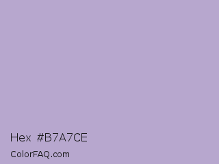 Hex #b7a7ce Color is a light violet color and the nearest color is London Hue #bea6c3. Hex code #b7a7ce and RGB value is rgb(183,167,206). In RGB color space, this color is composed of 72% red, 65% green, 81% blue, In CMYK color space, this color is composed of 11% cyan, 19% magenta, 0% yellow , 19% black , In HSL color space, this color has a hue angle of 265° , 28% saturation and 73% lightness.