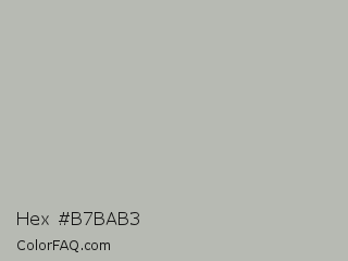 Hex #b7bab3 Color is a light green color and the nearest color is Ash Gray #b2beb5. Hex code #b7bab3 and RGB value is rgb(183,186,179). In RGB color space, this color is composed of 72% red, 73% green, 70% blue, In CMYK color space, this color is composed of 2% cyan, 0% magenta, 4% yellow , 27% black , In HSL color space, this color has a hue angle of 86° , 5% saturation and 72% lightness.