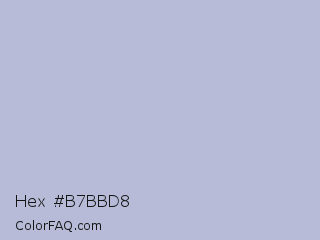 Hex #b7bbd8 Color is a light blue color and the nearest color is Lavender Gray #bdbbd7. Hex code #b7bbd8 and RGB value is rgb(183,187,216). In RGB color space, this color is composed of 72% red, 73% green, 85% blue, In CMYK color space, this color is composed of 15% cyan, 13% magenta, 0% yellow , 15% black , In HSL color space, this color has a hue angle of 233° , 30% saturation and 78% lightness.