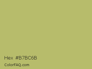 Hex #b7bc6b Color is a normal yellow color and the nearest color is Gimblet #b8b56a. Hex code #b7bc6b and RGB value is rgb(183,188,107). In RGB color space, this color is composed of 72% red, 74% green, 42% blue, In CMYK color space, this color is composed of 3% cyan, 0% magenta, 43% yellow , 26% black , In HSL color space, this color has a hue angle of 64° , 38% saturation and 58% lightness.