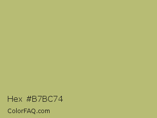 Hex #b7bc74 Color is a normal yellow color and the nearest color is Misty Moss #bbb477. Hex code #b7bc74 and RGB value is rgb(183,188,116). In RGB color space, this color is composed of 72% red, 74% green, 45% blue, In CMYK color space, this color is composed of 3% cyan, 0% magenta, 38% yellow , 26% black , In HSL color space, this color has a hue angle of 64° , 35% saturation and 60% lightness.
