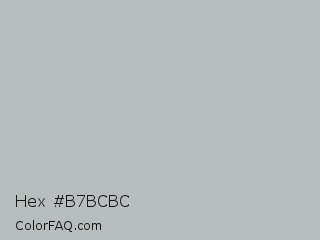 Hex #b7bcbc Color is a light cyan color and the nearest color is Gray X11 Gray #bebebe. Hex code #b7bcbc and RGB value is rgb(183,188,188). In RGB color space, this color is composed of 72% red, 74% green, 74% blue, In CMYK color space, this color is composed of 3% cyan, 0% magenta, 0% yellow , 26% black , In HSL color space, this color has a hue angle of 180° , 4% saturation and 73% lightness.