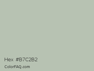 Hex #b7c2b2 Color is a light green color and the nearest color is Green Spring #b8c1b1. Hex code #b7c2b2 and RGB value is rgb(183,194,178). In RGB color space, this color is composed of 72% red, 76% green, 70% blue, In CMYK color space, this color is composed of 6% cyan, 0% magenta, 8% yellow , 24% black , In HSL color space, this color has a hue angle of 101° , 12% saturation and 73% lightness.