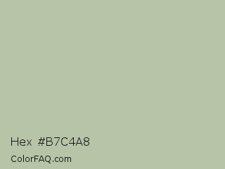 Hex #b7c4a8 Color is a light green color and the nearest color is Rainee #b9c8ac. Hex code #b7c4a8 and RGB value is rgb(183,196,168). In RGB color space, this color is composed of 72% red, 77% green, 66% blue, In CMYK color space, this color is composed of 7% cyan, 0% magenta, 14% yellow , 23% black , In HSL color space, this color has a hue angle of 88° , 19% saturation and 71% lightness.