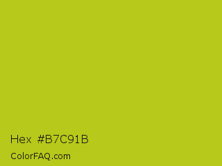 Hex #b7c91b Color is a normal yellow color and the nearest color is Key Lime Pie #bfc921. Hex code #b7c91b and RGB value is rgb(183,201,27). In RGB color space, this color is composed of 72% red, 79% green, 11% blue, In CMYK color space, this color is composed of 9% cyan, 0% magenta, 87% yellow , 21% black , In HSL color space, this color has a hue angle of 66° , 76% saturation and 45% lightness.