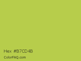 Hex #b7cd4b Color is a normal yellow color and the nearest color is June Bud #bdda57. Hex code #b7cd4b and RGB value is rgb(183,205,75). In RGB color space, this color is composed of 72% red, 80% green, 29% blue, In CMYK color space, this color is composed of 11% cyan, 0% magenta, 63% yellow , 20% black , In HSL color space, this color has a hue angle of 70° , 57% saturation and 55% lightness.