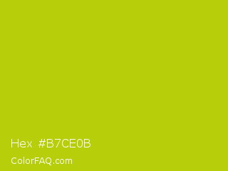 Hex #b7ce0b Color is a normal yellow color and the nearest color is Rio Grande #bbd009. Hex code #b7ce0b and RGB value is rgb(183,206,11). In RGB color space, this color is composed of 72% red, 81% green, 4% blue, In CMYK color space, this color is composed of 11% cyan, 0% magenta, 95% yellow , 19% black , In HSL color space, this color has a hue angle of 67° , 90% saturation and 43% lightness.