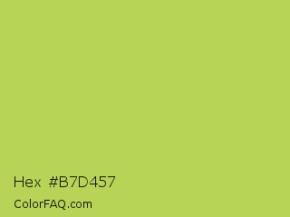Hex #b7d457 Color is a normal lime color and the nearest color is June Bud #bdda57. Hex code #b7d457 and RGB value is rgb(183,212,87). In RGB color space, this color is composed of 72% red, 83% green, 34% blue, In CMYK color space, this color is composed of 14% cyan, 0% magenta, 59% yellow , 17% black , In HSL color space, this color has a hue angle of 74° , 59% saturation and 59% lightness.