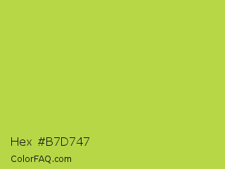 Hex #b7d747 Color is a normal lime color and the nearest color is Conifer #acdd4d. Hex code #b7d747 and RGB value is rgb(183,215,71). In RGB color space, this color is composed of 72% red, 84% green, 28% blue, In CMYK color space, this color is composed of 15% cyan, 0% magenta, 67% yellow , 16% black , In HSL color space, this color has a hue angle of 73° , 64% saturation and 56% lightness.