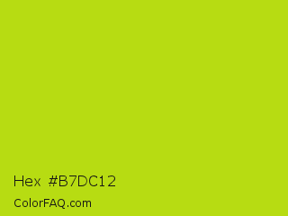 Hex #b7dc12 Color is a normal lime color and the nearest color is Fuego #bede0d. Hex code #b7dc12 and RGB value is rgb(183,220,18). In RGB color space, this color is composed of 72% red, 86% green, 7% blue, In CMYK color space, this color is composed of 17% cyan, 0% magenta, 92% yellow , 14% black , In HSL color space, this color has a hue angle of 71° , 85% saturation and 47% lightness.