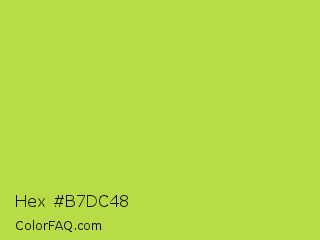 Hex #b7dc48 Color is a normal lime color and the nearest color is Conifer #acdd4d. Hex code #b7dc48 and RGB value is rgb(183,220,72). In RGB color space, this color is composed of 72% red, 86% green, 28% blue, In CMYK color space, this color is composed of 17% cyan, 0% magenta, 67% yellow , 14% black , In HSL color space, this color has a hue angle of 75° , 68% saturation and 57% lightness.