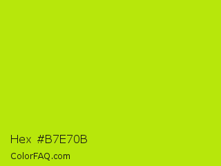 Hex #b7e70b Color is a normal lime color and the nearest color is Inch Worm #b0e313. Hex code #b7e70b and RGB value is rgb(183,231,11). In RGB color space, this color is composed of 72% red, 91% green, 4% blue, In CMYK color space, this color is composed of 21% cyan, 0% magenta, 95% yellow , 9% black , In HSL color space, this color has a hue angle of 73° , 91% saturation and 47% lightness.