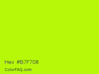 Hex #b7f708 Color is a normal lime color and the nearest color is Lime #bfff00. Hex code #b7f708 and RGB value is rgb(183,247,8). In RGB color space, this color is composed of 72% red, 97% green, 3% blue, In CMYK color space, this color is composed of 26% cyan, 0% magenta, 97% yellow , 3% black , In HSL color space, this color has a hue angle of 76° , 94% saturation and 50% lightness.