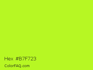 Hex #b7f723 Color is a normal lime color and the nearest color is Green Yellow #adff2f. Hex code #b7f723 and RGB value is rgb(183,247,35). In RGB color space, this color is composed of 72% red, 97% green, 14% blue, In CMYK color space, this color is composed of 26% cyan, 0% magenta, 86% yellow , 3% black , In HSL color space, this color has a hue angle of 78° , 93% saturation and 55% lightness.