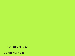 Hex #b7f749 Color is a light green color and the nearest color is Inchworm #b2ec5d. Hex code #b7f749 and RGB value is rgb(183,247,73). In RGB color space, this color is composed of 72% red, 97% green, 29% blue, In CMYK color space, this color is composed of 26% cyan, 0% magenta, 70% yellow , 3% black , In HSL color space, this color has a hue angle of 82° , 92% saturation and 63% lightness.