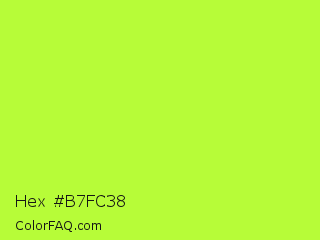 Hex #b7fc38 Color is a normal green color and the nearest color is Green Yellow #adff2f. Hex code #b7fc38 and RGB value is rgb(183,252,56). In RGB color space, this color is composed of 72% red, 99% green, 22% blue, In CMYK color space, this color is composed of 27% cyan, 0% magenta, 78% yellow , 1% black , In HSL color space, this color has a hue angle of 81° , 97% saturation and 60% lightness.