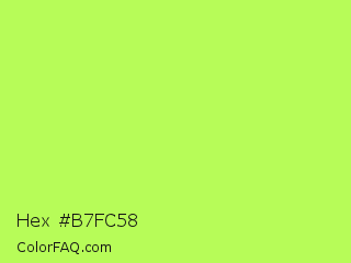 Hex #b7fc58 Color is a light green color and the nearest color is Inchworm #b2ec5d. Hex code #b7fc58 and RGB value is rgb(183,252,88). In RGB color space, this color is composed of 72% red, 99% green, 35% blue, In CMYK color space, this color is composed of 27% cyan, 0% magenta, 65% yellow , 1% black , In HSL color space, this color has a hue angle of 85° , 96% saturation and 67% lightness.