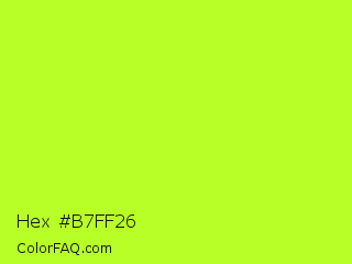 Hex #b7ff26 Color is a normal green color and the nearest color is Green Yellow #adff2f. Hex code #b7ff26 and RGB value is rgb(183,255,38). In RGB color space, this color is composed of 72% red, 100% green, 15% blue, In CMYK color space, this color is composed of 28% cyan, 0% magenta, 85% yellow , 0% black , In HSL color space, this color has a hue angle of 80° , 100% saturation and 57% lightness.