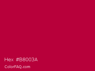 Hex #b8003a Color is a normal rose color and the nearest color is Crimson Glory #be0032. Hex code #b8003a and RGB value is rgb(184,0,58). In RGB color space, this color is composed of 72% red, 0% green, 23% blue, In CMYK color space, this color is composed of 0% cyan, 100% magenta, 68% yellow , 28% black , In HSL color space, this color has a hue angle of 341° , 100% saturation and 36% lightness.