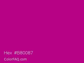 Hex #b80087 Color is a normal magenta color and the nearest color is Red Violet #c71585. Hex code #b80087 and RGB value is rgb(184,0,135). In RGB color space, this color is composed of 72% red, 0% green, 53% blue, In CMYK color space, this color is composed of 0% cyan, 100% magenta, 27% yellow , 28% black , In HSL color space, this color has a hue angle of 316° , 100% saturation and 36% lightness.