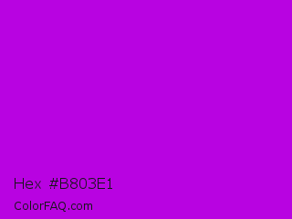 Hex #b803e1 Color is a normal purple color and the nearest color is Vivid Mulberry #b80ce3. Hex code #b803e1 and RGB value is rgb(184,3,225). In RGB color space, this color is composed of 72% red, 1% green, 88% blue, In CMYK color space, this color is composed of 18% cyan, 99% magenta, 0% yellow , 12% black , In HSL color space, this color has a hue angle of 289° , 97% saturation and 45% lightness.