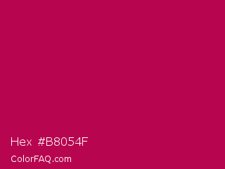 Hex #b8054f Color is a normal rose color and the nearest color is Pictorial Carmine #c30b4e. Hex code #b8054f and RGB value is rgb(184,5,79). In RGB color space, this color is composed of 72% red, 2% green, 31% blue, In CMYK color space, this color is composed of 0% cyan, 97% magenta, 57% yellow , 28% black , In HSL color space, this color has a hue angle of 335° , 95% saturation and 37% lightness.