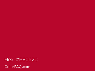 Hex #b8062c Color is a normal red color and the nearest color is Shiraz #b20931. Hex code #b8062c and RGB value is rgb(184,6,44). In RGB color space, this color is composed of 72% red, 2% green, 17% blue, In CMYK color space, this color is composed of 0% cyan, 97% magenta, 76% yellow , 28% black , In HSL color space, this color has a hue angle of 347° , 94% saturation and 37% lightness.