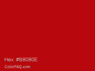 Hex #b8080e Color is a normal red color and the nearest color is Milano Red #b81104. Hex code #b8080e and RGB value is rgb(184,8,14). In RGB color space, this color is composed of 72% red, 3% green, 5% blue, In CMYK color space, this color is composed of 0% cyan, 96% magenta, 92% yellow , 28% black , In HSL color space, this color has a hue angle of 358° , 92% saturation and 38% lightness.
