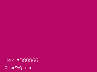 Hex #b80866 Color is a normal rose color and the nearest color is Lipstick #ab0563. Hex code #b80866 and RGB value is rgb(184,8,102). In RGB color space, this color is composed of 72% red, 3% green, 40% blue, In CMYK color space, this color is composed of 0% cyan, 96% magenta, 45% yellow , 28% black , In HSL color space, this color has a hue angle of 328° , 92% saturation and 38% lightness.
