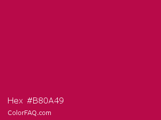 Hex #b80a49 Color is a normal rose color and the nearest color is Pictorial Carmine #c30b4e. Hex code #b80a49 and RGB value is rgb(184,10,73). In RGB color space, this color is composed of 72% red, 4% green, 29% blue, In CMYK color space, this color is composed of 0% cyan, 95% magenta, 60% yellow , 28% black , In HSL color space, this color has a hue angle of 338° , 90% saturation and 38% lightness.