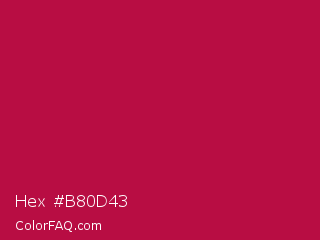 Hex #b80d43 Color is a normal rose color and the nearest color is Pictorial Carmine #c30b4e. Hex code #b80d43 and RGB value is rgb(184,13,67). In RGB color space, this color is composed of 72% red, 5% green, 26% blue, In CMYK color space, this color is composed of 0% cyan, 93% magenta, 64% yellow , 28% black , In HSL color space, this color has a hue angle of 341° , 87% saturation and 39% lightness.
