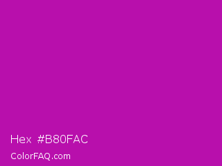 Hex #b80fac Color is a normal magenta color and the nearest color is Heliotrope Magenta #aa00bb. Hex code #b80fac and RGB value is rgb(184,15,172). In RGB color space, this color is composed of 72% red, 6% green, 67% blue, In CMYK color space, this color is composed of 0% cyan, 92% magenta, 7% yellow , 28% black , In HSL color space, this color has a hue angle of 304° , 85% saturation and 39% lightness.