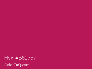 Hex #b81757 Color is a normal rose color and the nearest color is Rose Red #c21e56. Hex code #b81757 and RGB value is rgb(184,23,87). In RGB color space, this color is composed of 72% red, 9% green, 34% blue, In CMYK color space, this color is composed of 0% cyan, 88% magenta, 53% yellow , 28% black , In HSL color space, this color has a hue angle of 336° , 78% saturation and 41% lightness.