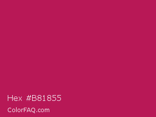 Hex #b81855 Color is a normal rose color and the nearest color is Rose Red #c21e56. Hex code #b81855 and RGB value is rgb(184,24,85). In RGB color space, this color is composed of 72% red, 9% green, 33% blue, In CMYK color space, this color is composed of 0% cyan, 87% magenta, 54% yellow , 28% black , In HSL color space, this color has a hue angle of 337° , 77% saturation and 41% lightness.