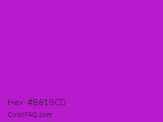 Hex #b81bcd Color is a normal magenta color and the nearest color is Vivid Mulberry #b80ce3. Hex code #b81bcd and RGB value is rgb(184,27,205). In RGB color space, this color is composed of 72% red, 11% green, 80% blue, In CMYK color space, this color is composed of 10% cyan, 87% magenta, 0% yellow , 20% black , In HSL color space, this color has a hue angle of 293° , 77% saturation and 45% lightness.