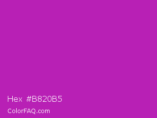 Hex #b820b5 Color is a normal magenta color and the nearest color is Byzantine #bd33a4. Hex code #b820b5 and RGB value is rgb(184,32,181). In RGB color space, this color is composed of 72% red, 13% green, 71% blue, In CMYK color space, this color is composed of 0% cyan, 83% magenta, 2% yellow , 28% black , In HSL color space, this color has a hue angle of 301° , 70% saturation and 42% lightness.