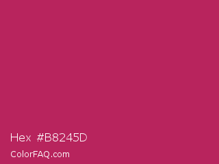 Hex #b8245d Color is a normal rose color and the nearest color is Rose Red #c21e56. Hex code #b8245d and RGB value is rgb(184,36,93). In RGB color space, this color is composed of 72% red, 14% green, 36% blue, In CMYK color space, this color is composed of 0% cyan, 80% magenta, 49% yellow , 28% black , In HSL color space, this color has a hue angle of 337° , 67% saturation and 43% lightness.